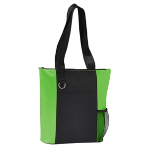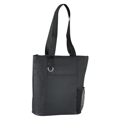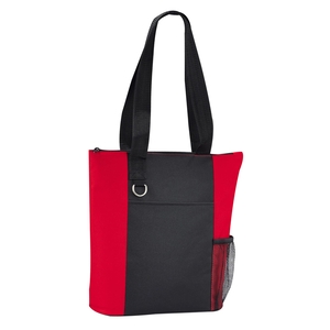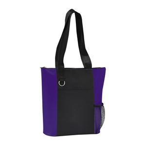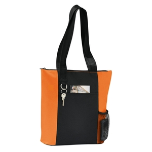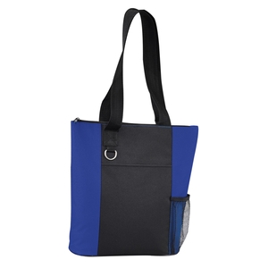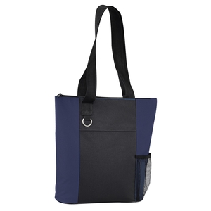 The Infinity Convention Tote has a zippered main compartment with a 11.5" handle drop. It additionally features an open front pocket key ring and a side mesh pocket. Bottom piping has been removed.